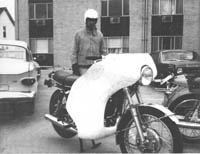 | Winter was coming and that meant cold and wet. Bob Dennis, co-owner of Yamaha Sportland in Urbana asked me when I was going to make that fairing I had been talking about since summer. The idea of a fairing became more important. "Right now", I replied. I drove my Yamaha 305 to the local boat shop in Paxton, IL, bought resin, catylist and a bundle of fibreglass. After a 15-minute course by Ray Diskin, owner, in resin mixing and laminating, I strapped everything on the back of my bike and rode home to Champaign, IL. That was October 13, 1966. | |||||||||||||||||||||||||||||||||||||||||||||||||||||||||||||