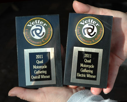 | For the first time ever, electric bikes will compete in a Vetter Challenge, against gas machines. Against Diesels. Nobody expects an electric bike to actually go 140 miles* at real highway speeds. Yet. But, how far can they go? The one that goes the farthest will be the winner. * I have previously posted the 2011 ride to be 100 miles, more or less. But, last year, the ride was closer to 140 miles. The exact route is determined by the Quail officials. With California roads being closed because of local disruptions, be prepared. | ||||||||||||||||||||||||||||||||||||