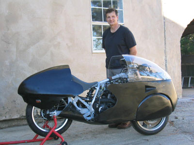 | Bungi's streamlined 250 Kawasaki: The front wheel is inside a ball turret which is about the only way I know to keep the air smooth around the turning wheel. Another very clever solution to a real problem! | |||||||||||||||||||||||||||||||||||||||||||