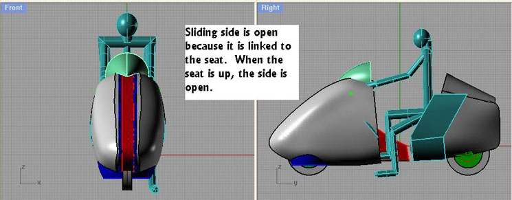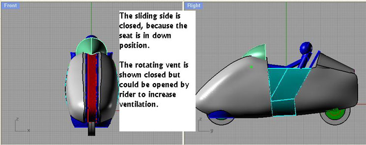 | Kraig says: "The rider can move from Cruiser riding posture to recumbent rider position while riding down the road. (I will have the seat release switch mounted on the handlebars.) I will mechanically link the seat with the sliding side doors to make the sides open and close based on the seat position. This means, that the rider will be able to put his feet down ONLY when in the unright/cruiser riding position. (This is actually a good thing, because putting your foot down in the recumbent position on a moving motorcycle is a good way to have your leg ripped off). Another feature that might not jump out at you is that the front wheel is riding inside a Spherically shaped "fender". This allows the openings in the fairing to be much smaller than normally possible. I have an agreement with Charles Bugni (pronounced "Boo-Nay") to use this patented technology. | |||||||||||||||||||||||||||||||||||||||||||