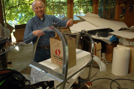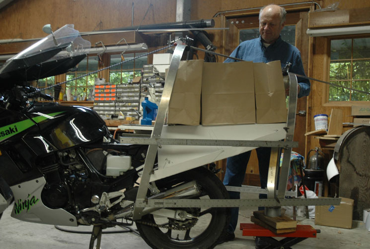 | Storage space is at a premium on motorcycles. I spotted some unused space under the new shelf. I emptied out my little "Tenex Model 410" trash container and asked Alan to hold it in place under the floor just behind the rear tire. It seems to fit perfectly. Before we are done, we will cut a hole into the shelf and drop the container in from the top. Saddlebags and tail trunks have been an accepted tradition for years. But they "Un-streamline" the bike by making it wider at the rear... not pointed. Wouldn't it be wonderful to have excess carrying capacity? Streamlining gives us that extra carrying capacity and at the same time, allows us to burn less fuel. | ||||||||||||||||||||||