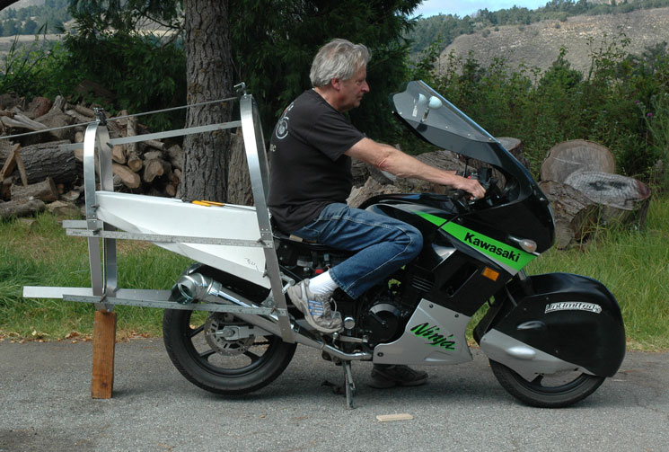 | We were surprised to discover that five grocery bags would fit The fifth bag at the rear is a little squished but when we tip the tail up into its proper location, it will have more room. To win a Vetter Fuel Challenge, you must be able to carry at least four grocery bags, open top up, unsquished (to the satisfaction of my wife and Challenge Judge, Carol Vetter). Some complain that the requirement to carry a useful load - like four bags of groceries - means we will all look the same. It is probably true. I have been saying for years that when we are properly streamlined, we will all look the same. Get over it. | ||||||||||||||||||||||