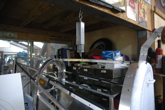 | Alan figures that the two, 10 pound C-clamps make it seem to weigh 33 pounds. Actually, it looks like the thickness of the aluminum can be reduced almost everywhere without any loss in strength. This can take significant weight out. We decided to weigh the original Ninja parts Alan removed along the way: 17 pounds of removed Ninja pieces We figure the Streamlined rear Bodywork, when completed, will add around 20 pounds to the weight of the stock Ninja. Net gain: 15 pounds, so far | ||||||||||||||||||||||||||||||||||||||||||||||||||||||||||||