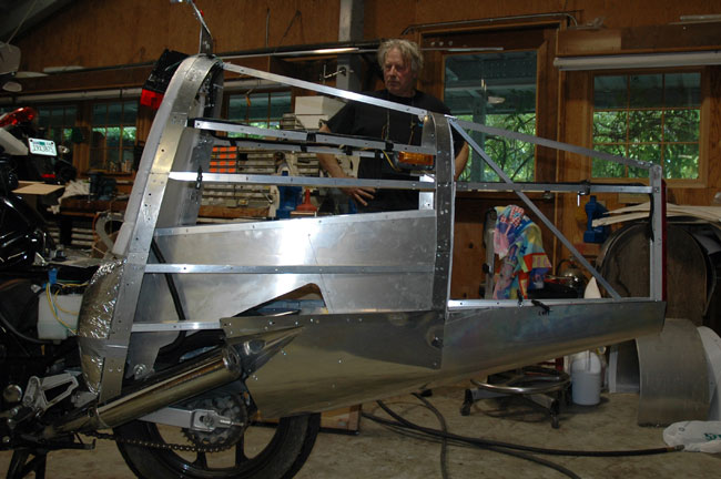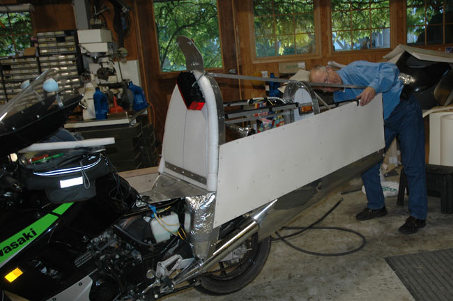 | The first Vetter Streamliner Kit is light, strong, holds four bags of groceries and can be made with simple tools. The whole thing goes on or off with (3) bolts. One reader asked how we get access to the rear storage: "Good question. The Ninja 250 is very small and the rear storage sump is not that far back. Before we settled upon this design, we made sure it was easy to get to. We can easily reach all the way into every corner. I would not make a mistake like that. We put the storage sump in to guarantee the carrying of 4 bags of groceries. Of course, we do not always carry 4 bags of groceries, but, it is nice to have the storage space. If it was mine, I would throw lightweight stuff in there I did not have to get to very often: a bottle of oil... a qt of extra gas... rags, cold weather stuff, etc. I think I would cover it with a little sheet of aluminum trap door lid. I'd keep heavy tools stowed more forward to keep the Center of Gravity forward. It will be interesting to see how Alan uses his space. Glad you are paying attention." Craig | ||||||||||||||||||||||||||||||||||||||||||||||||||||||||||||