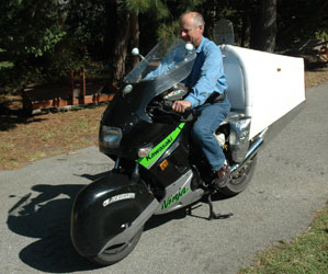 | You can see how we built a real Vetter Streamlined Tail for his little Ninja In Chapters 44 thru 49. Now he can carry four bags of gorceries without any arguements. Alan could be a real contender. It is time to finish the streamlining by adding the Vetter streamlined nose. It became clear that we needed a second Ninja to play with. Besides being possibly the best gas motor bike to streamline for a Vetter Fuel Economy Challenge, used Kawasaki Ninja 250s loose their value when dropped. We can afford to experiment with the little Ninjas. Alan found this one on Craigs List: | |||||||||||||||||||||||||||||||||||||