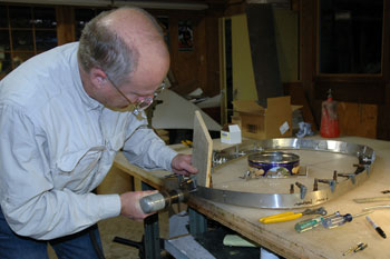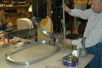 | These are all the pieces needed to make the nose. It is critical that they be cut out accurately. The bulkheads Alan is pointing to are .100" aluminum. The bands are .032" alum. which simply form around the bulkhead perfectly. | |||||||||||||||||||||||||||||||||||||