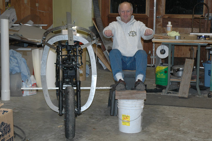| A variety of riding positions Alan is mocking up the new handlebars. They must be about 6" higher and farther back. Alan wants to be able to sit comfortably and also be able to move about to stay comfortable. After all, this is to be a serious cross-country machine. The main mount for the nose is a very strong crossbar. It will be used for the forward controls as well as providing a feet-forward sitting style. | |||||||||||||||||||||||||||||||||||||
