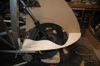 | I check to see how the nose curve will fit over the bigger Ninja front wheel. It looks fine. Alan pretends he is cruising with his feet on the pegs, holding his hands in a comfortable position. We will have to make new handlebars for this new riding position. Alan thinks it feels fine, too. | |||||||||||||||||||||||||||||||||||||