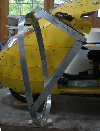 | Alan drills for flush mount Pop Rivits and assembles the nose. Each little angle bracket has a different angle. Taking the time to make sure each was at the perfect angle made assembly easy. Alan and I are learning these little tricks so we can pass them on to you when you make your streamliner kit. Before we put the aluminum skin on, we propped the nose structure on the bike to see what we have: | |||||||||||||||||||||||||||||||||||||