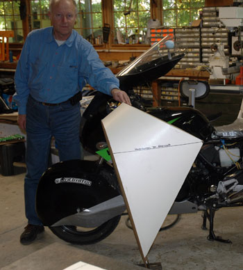 | The nose is being designed to be arttatched with three fasteners, just like the tail. Alan has made his bracket attach to the existing Ninja fairing mount. A quick wrap in temporary milk carton paper begins to give us an idea of the size of the streamlining. | |||||||||||||||||||||||||||||||||||||