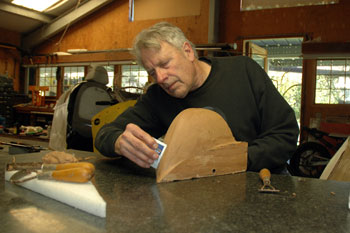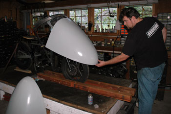 | Explaining the clay pattern for the hand streamlined pieces to Dave Smith who sees some kind of 1930s art deco thing. | Dave and company prep the nose mold for the first Vetter streamliner nose parts. Scraping the clay out took time. | |||||||||||||||||||||||||||||||||||||
