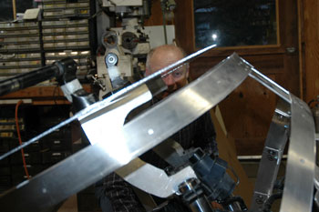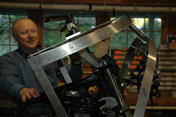 | While I have been developing the new windshield, Alan has been working hard to make the special brackets he will need to make the Last Vetter Fairing fit on his bike. It is very convenient to be able to swap back and forth to his bike to be sure it works. The tricky thing here is getting the bodywork moved parallel to the rotating plate that holds the handlebars. | ||||||||||||||||||||||||||||||||||||||