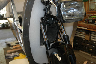 | Foam Bulkhead Before he can skin his Streamliner with aluminum, Alan makes a bulkhead across the front of 1" packing foam. Its main purpose is to funnel any and all air thru the radiator. Additionally, it will help to keep Alan dry in the rain. | |||||||||||||||||||||