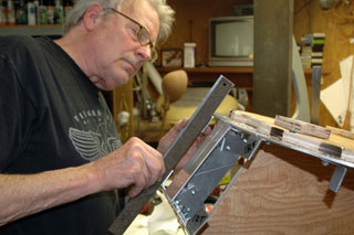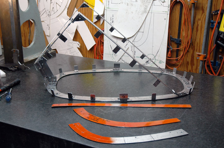 | Checking alignment with a staight-edge. The goal here is is to bend the little mounting tabs so the aluminum skin will wrap around without gaps. Much of the strength of the nose will come from the aluminum skin. | |||||||||||||||||||||
