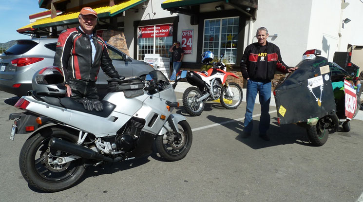 | March 10, Alan Smith adds: Just a couple of comments on today's test ride. First Vic was top dog on this informal economy gas run 100 MPG, congratulations. The fuel economy between my "new" 2004 Ninja 250 (12,900-miles on it) and Ken's 2014 Honda CRF250L (600-miles on it) was much closer than I thought it would be, Alan 77 mpg vs Ken 83 mpg. Both bikes were stock. It should also be noted that I did not lay down on the gas tank during the entire ride. I wanted to get a baseline gas mileage on the stock Ninja 250. Ken said that he laid down on the gas tank about 80% of the ride, tire pressure 32 pounds front and rear. With today's results I think the Ninja 250 is still a viable contender in the motorcycle fuel economy contests. At least until Charly or Fred's diesel powered motorcycle shows up. For those that don't know it I picked up a very clean 2004 Ninja 250 for $800.00. This bike will be my test mule for engine development and eventually the next generation streamliner. I think it will take a year to get the next bike built. I still plan to compete with my 2005 streamlined Ninja 250 this year. Ken, thanks for coming out to ride with us. It was a fun day, Alan Smith | ||||||||||||||||||||||||||||||||||||||||
