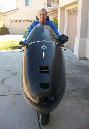 | Vic says: "! cut out some openings for the headlight and cooling intake early last week, attached the nose and did a short rode test. I needed to do some trimming for tire clearance but everything else was fine. i then started making the framework to mount my side panels and windscreen ( coroplast for now ) and this went pretty fast. I was able to do some ride with everything in place and it feels great. I mounted my turn signals yesterday. I need to trim back the side panels around my legs so that I can get my feet down more easily. I also need to finish the headlight opening and the cooling intake/ ducting. | ||||||||||||||||||||||||||||||||||||||||