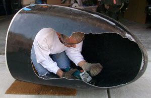 | Here Vic fiberglasses the two halves together. Note: Vic has first Pop Rivited strips of aluminum into the inside to force the two fi glass pieces together, makng them fit as good as possible. Use aluminum Pop Rivits. Then he sanded the outside down to "feather" the edges. This allows him to end up with a substantial thickness of a fiberglass band for strength. | ||||||||||||||||||||||||||||||||||||||||