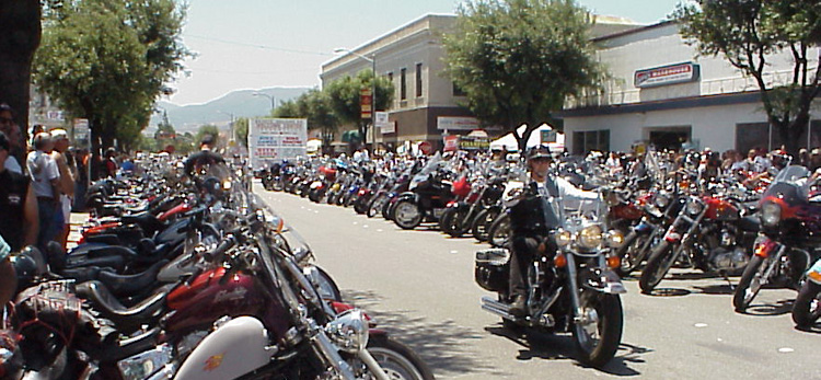 | Mike doesn't just stay at his factory. He has become a part of the local "Establishment". Back in 2000, he was instrumental in reviving the infamous Hollister Rally. At any Hollister event, the Corbin factory is the center of motorcycling: | |||||||||||