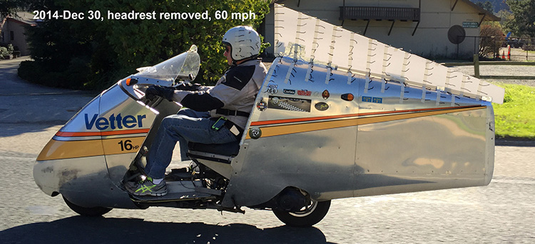 | Test 1 produced this shocking image: Look carefully at the sharp crease between the body and the headrest. The air was going backwards behind Alan's head. This was terrible. Air going the wrong way is the opposite of streamlining. Could this air reversal be fixed? And if so, would it produce a measurable reduction in cost? In spite of this, Alan was getting around 140mpg at 70mph. (2.6¢ mile) | ||||||||||||||||||||||||||||||||||