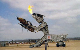 | Doug Malewickie's best known design is the car and airplane-eating "Robosaurus" Doug used a shakey, single cylinder industrial Diesel in his California Commuter. He still sells plans for.this machine. Doug's web page. Personally, I have always been concerned that the Commuter was too low to the ground to be visible to other traffic. A big Pete would never see him. Maybe the nifty pylon lamp assembly could be run up 3 or 4 more feet... | ||||||||||||||||||||||||||||