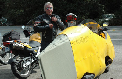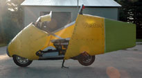 | Conclusions, Sept 1, 2008: I am convinced that true streamlining - round at the front, pointed at the tail - is feasible on single track vehicles, in the worst wind conditions. The rider comfort inside real streamlining is unmatched. I can carry anything I want and it is inside, safe and streamlined. I still do not know if we will burn less fuel with a bigger engine running slower - or - a smaller engine running faster. I won't know until I am as streamlined as I can get. Right now, it is looking like a bigger engine, like Carol's BMW turning slower may have better potential. A too-flexible tail is not a great idea. Keep in mind, my goal is to go 70 mph, into a 20 mph headwind, carrring 4 bags of groceries and get 100 mpg. (that is 4¢ a mile, by the way.) With its 40 mph head winds, Highway 101 is a lot tougher than my goal. It is time to pack up and go to BUB Speed Trials at Bonneville where I hope to discuss streamlining changes with FIM officials. It is time to reconsider the bans on real streamlining that the FIM has had in place since 1957. | |||||||||||||||||||||||||||||||||