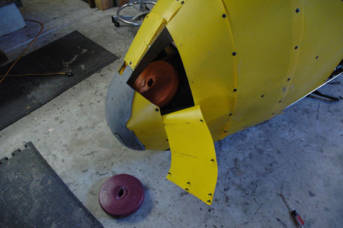 | I peeled open the front and found a place for an 18 pound bar bell weight. I made a mounting bracket for it to make sure it would not fall out and get tangled in the front wheel. There was not room for two bar bell weights, so I tie-wrapped two, 5 pound lead balls in for good measure. The new weight adding up to 28 pounds. | |||||||||||||||||||||||||||||||||