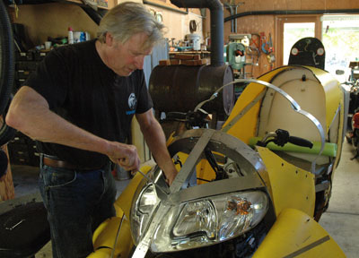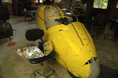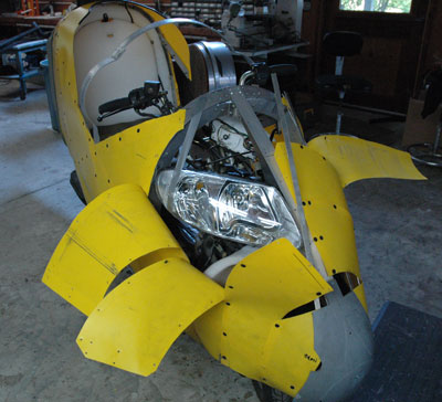 | Having chosen plastic "Christmas Tree" fasteners to hold the yellow plastic made it easy to peel the skin away. Altho the fasteners get a little torn up, they can be re used. The lights fit in amazingly well, but not perfectly. The main bulkhead is about 2" too far forward to allow them to be aimed exactly straight forward. This will be easy to correct when I make a mold for the front. In the meantime... these lights look good to me. I will just use one headlight. The Helix probably does not have enough electrical output for both lights. | ||||||||||||||||||||||||||||||||||||||||||
