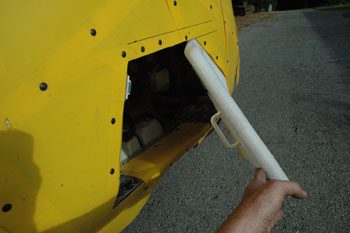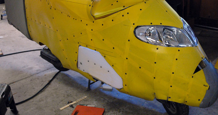 | I attached the yellow plastic "slip panel" with lightweight plastic screws ... the same screws that I used to fasten windshields onto my Windjammers. Lightweight... perfect. You will notice the little plastic handle I installed to pull it closed if I needed to. It turned out to be unnecessary. By tweaking everything, I got the door to naturally want to stay closed. If it didn't, I found that by tapping it out, the "spring-back" would snap it closed. I was prepared to add a flexible tab, sticking out into the wind which might blow the door closed. Oddly, there does not seem to be any wind sucking the door in or out in this region. I don't know if the tab would work or not. It is time for tuft testing to get some idea of what is going on with the air flow. This will make a good movie. Next time. | |||||||||||||||||||||||||||||||||||||||