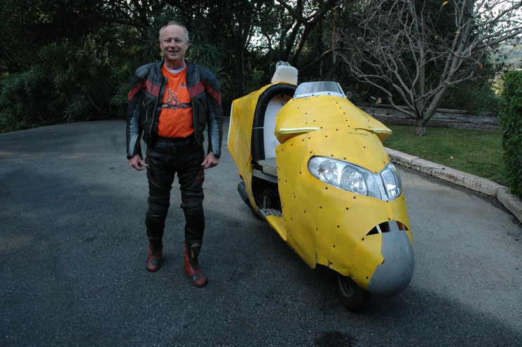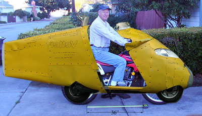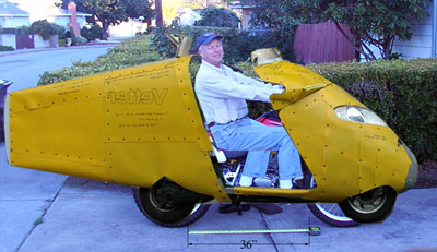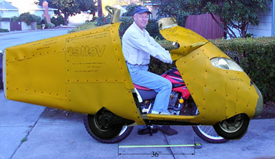 | "I got an offer to test ride Craig Vetter’s “Freedom Machine”. What made me nervous was that except for Craig, I was the only other person to ride it. I never rode a streamliner until this year. Last July in Ohio I rode two streamliners at the “Gathering of the Streamliners”. Craig’s streamliner would be my third this year. After getting a short briefing on the controls I was turned loose. Actually the controls are straight forward, the same as a standard Honda Helix 250cc scooter. Craig rode with me on a Suzuki Burgman 400 scooter. I've ridden motorcycles and scooters from 1930 to present. It always feels awkward to get on a different bike. My first impression of Craig’s “Freedom Machine” was that it feels a little claustrophobic with all the aerodynamic panels surrounding me. Once underway I did not notice being enclosed anymore. Despite the bulky look of Craig’s streamliner, it felt very light. When we got out on the open road I wondered why Craig was going so slow. I looked at the speedometer we were already going over the 50 MPH speed limit. In a streamliner there is no wind blowing over a rider to give a sensation of speed. It is dead calm inside Craig’s “Freedom Machine”. Riding in hilly country one must be careful not to accelerate over the speed limit going downhill. | |||||||||||||||||||||||||||||||||||||