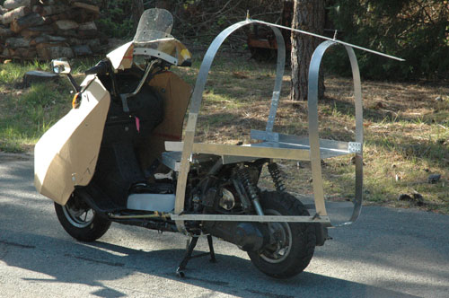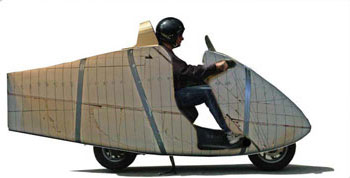 | As I build and ride this thing, solutions to problems emerge. For example, where will I put the license plate, tail light and turn signals? They cannot go on the point because it is a point and there is nothing there to put them on! The solution appeared when I realized that I could not completely streamline the area around my head. The air will be "Dirty" (unstreamlined there). I will mount these components in the headrest. Better to have just one area of "Dirty-ness" than many small ones. Actually, the lights will be more visible up there, thus we will be safer. In addition, we don't need the tail in the city. So, I will make the tail go on for cross country cruising and go off easily for inner city riding. This means that, with the tail off, my Helix will be the same length as stock. Quick! Name me any 2-wheeler than can carry 3 bags of groceries. I see this thing as a "two wheeled truck." If it cannot carry at least 3 bags of groceries, what good is it? The next step, then, is to make a "truck bed" and be sure it is streamlined. | |||||||||||||||||||||||||||||||