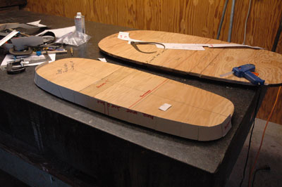 | Next: making the rear bulkhead: If you look closely, you can see the 4" extensions in the loop in the background. Making the rear bulkhead is just like making the middle one. Using CAD and a hot melt gun, I generate the shape and transfer it to a piece of plywood. | |||||||||||||||||||||||||||||||