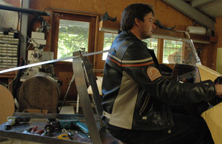 | With the bed and bulkhead finally in place, a serious problem shows up. I made the streamlined body to fit me. (Top, left) My son, Zak, sits 4" higher, from his seat to his shoulders. Top right. Zak won't be able to ride this thing because he won't fit into it. Many of my friends won't either. If I raise the top line 4", frontal area goes up too and I won't be as streamlined as I want. The solution? Reluctantly, I raise up the rear line 4" by adding an extension to the loop. I will make the seat with a 4" removable cushion for the big guys. This is better for me because a higher seat is more comfortable. Compromises, compromises. This is what design is all about. "You want this? You gotta give up that" Vetter Design Truth | |||||||||||||||||||||||||||||||