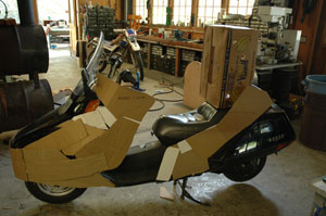 | It is easier to leave the Helix windshield in place so I can go for a ride and see what we have. All the foam board has been hot melted to the Helix and attached with screws and tape. | |||||||||||||||||||