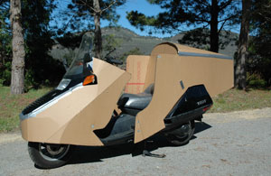 | After tacking together the final shape from little pieces, I trace around it and cut a single piece from a fresh piece of foam board. Tracing is an easy way to cut two pieces... one for each side. I get on and off all the time to be sure I will be able to ride this. No CAD (computer aided design) here. | |||||||||||||||||||