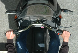 | Before I begin designing a slippery body, I want to rebend the handlebars to fit me. Honda has pulled the bars back so as to not hit the windshield at full lock. I don't like the feel so I bent the handlebars into a comfortable position for me. You can see that I had to grind notches out of the windshield. That is OK... I plan to replace whe windshield with a smaller one closer to me. Over a period of a week, I bent the bars- rode it -and rebent the bars until they felt right to me. I like fatter grips, too. This is all subjective. These little revisions make the Helix feel right to me. You may like Helix bars as is. | |||||||||||||||||||
