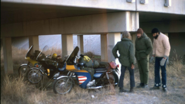 | We enjoyed life on the road... camping out, sleeping under bridges, etc. Up to then, the weather had been balmy, most unusual for the dead of winter. Soon after we left Houston, however, it rapidly became cold and wet. By the time we passed Little Rock, we were not happy. Worse, the forecast was for 7° above zero in Illinois. We had no choice but to go on. Crossing into Illinois, the north wind picked up and we began to freeze. It was in the low 20s and beginning to snow. We were dressed the best we knew how, in army surplus military clothing. After all, didn’t the military have the best equipment? The big barracks bag on my tank was stuffed with everything needed for two weeks, and it helped to keep me warm. My goose down jacket over a military OD wool sweater worked pretty well too. Our Vetter Phantom fairings did a good job in keeping the cold wind off us. However, my wool military liners inside welder’s gauntlets were not up to the freezing wind. My hands were getting cold. As a young designer, I had come to learn: “It is easy to solve a problem once you identify the problem” The problem was cold hands. The cold wind was taking the heat from my hands. The solution was to create a still-air insulating space around my hands so the wind could not take my heat away. How would I do that? More important, how would I do it right now, on the road when I needed it?I was carrying my military goose-down mummy sleeping bag, which, was insulated and wind resistant. It was rolled up, stowed away, doing nothing. I imagined how it could be formed in front of me to provide pockets for my hands and arms to slip into. At the next gas stop, I bought a roll of duct tape and went to work, which was hard with cold, non-working hands. I shaped the ends of the bag into pockets around the controls and my hands. I made openings just big enough to put my arms into so no air could get in. Then I duct taped the sleeping bag into place. | ||||||||||||||||||||||||||||||||||||||||||||||||||||||||||