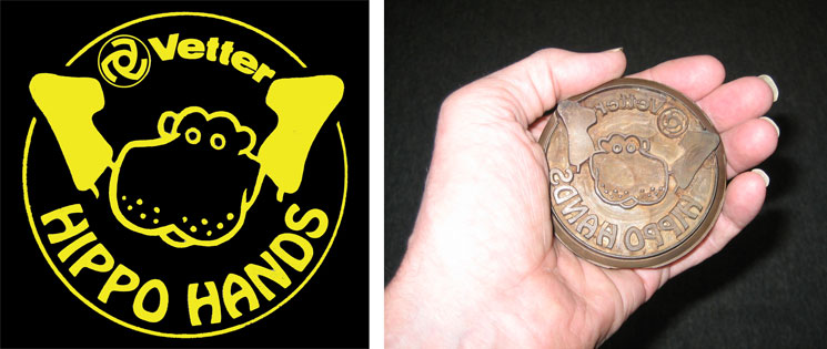 | Janet Kloock was a talented graphics artist from the U of Illinois. She produced the famous Hippo Hands logo. I don’t recall ever registering the name, “Hippo Hands.” Why waste the money? Who else would ever want to use such a name? The original bronze empossing die that branded a thousand Hippos was made by Everhot of Chicago. They were famous for branding horses, too. The die cost $350 in 1975 which is equivilant to $1,350 in inflated 2010 dollars. Development continued slowly, mainly because we were swamped with orders for Windjammers. I still wasn’t sure we had a product to sell in Hippo Hands, so there was no rush.