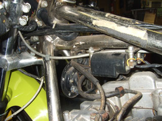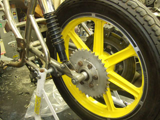 Tom Lester cast the aluminum wheels, especially for my racer. Derek also made this 1" longer swingarm. I raced with S&W shocks.