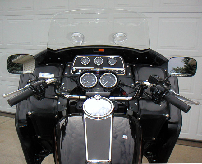 | This is one heck of a fairing! Can you imagine the comfort? Notice the instrument panel. We used VDO gauges and sending units. A complete Liberator also has the plastic panels that cover the big opening where the forks turn as seen above. In addition, we included an additional tonneau that bridged the big gap between the two sides. All this is more completely clarified in the original Liberator Mounting Instructions which you may download. | |||||||||||||||||||||||||||||||