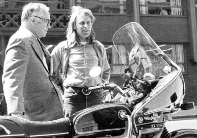 | 1975: Malcom Forbes, Craig Vetter and Malcom's new Blue Max Windjammer In those days, Malcom Forbes was one of the few high profile people who rode motorcycles. When Malcom ordered a Blue Max Windjammer for his BMW, I took the opportunity to visit him in New York. I found him to be a gracious host. Malcom went on to buy two of the ten Mystery Ships that I built. One for here... one for England. | |||||||||||||||||||||||||||