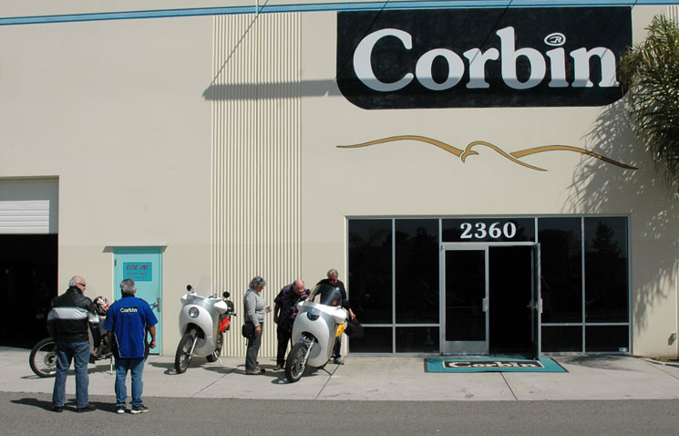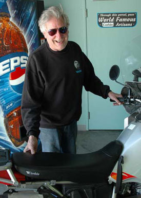 | Mike Corbin's shop is in Hollister, about 50 miles from us. We asked if he would make a couple of Corbin seats for our Alaska-bound 650s. "C'mon over Friday" he replied. Mike came out to meet us*. By the time we got there at 10 AM, there were eight bikes ahead of us! No matter, the Wizard's Cafe - Mike's 50s style restaurant - was right there and the food was really good! I suspect that Hollister locals sneak over there for lunch. *Mike came out to meet everyone. He seems to enjoy his business. | ||||||||||||||||||||||||||||||||||||||