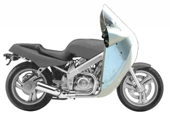 | Craig, I want one for my 89 Honda Hawk GT (NT650 v-twin, aluminum frame, single sided swing arm). Similar bike in European markets (Revere, NTV650 and later Deauville) had larger fuel tank, steel frame and shaft drive on a regular swing arm. Same engine was used in several Honda models including the TransAlp. Have owned my Hawk for several years and currently have a small cafe style fairing. - Prefer the Alcan in kit form to keep the price lower. - Price, I thought $750 sounded high until I started pricing other options to buy new. Sounds like the going market price for the entire package including mounts. I bought my current cafe style fairing several years ago and second hand. - Mounting kits should be available separately. - Possibly have the option to buy the top "air bearing" section and its mountings separately. Would want to buy/build/install top section first to use in the US Southeast (Atlanta, GA area) for warm fair weather and general riding. - Would plan to buy the lower / front fixed sections later for longer trips or cooler / wetter weather. - I also prefer designs based on function instead of style. Kind of hard to find such designs and probably harder to find a large market. Side note: I am also a fan of Buckminster Fuller and aviation (fixed wing and rotary). About your site: | ||||||||||||||||||||||||||||||||||||||