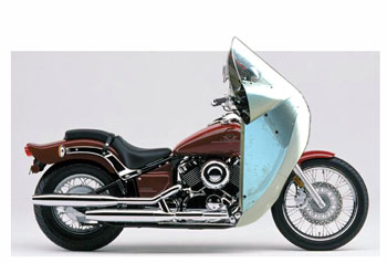 | Jeff says: "I like the Alcan fairing on the cruiser..looks sharp, very ultra modern." Kevin has an 1100 V-Star. He writes: "I like the possibilities! My older body likes the cruiser feel but I HATE the buffeting and how it wants to steer the bike on it's own. This looks to address the issues while giving some great protection from the elements. I would certainly like to see how the pricing and overall fit (pics around the bike - V-Star) looks. I do believe there is a market for this type of solution. After getting into the cruiser style bike I found (unfortunately too late) the numerous postings on the very problems I am looking to solve. Is this going to become a real possibility soon? I am a definite interested party. Without solutions such as this I may either end up with a convertible or going back to more traditional touring style bikes with the full fairing." | ||||||||||||||||||||||||||||||||||||||