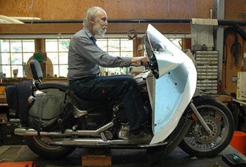 | Read this interesting note from Doug, a KZ1300 owner: Hi Doug: Thanks for this thoughtful letter. The bad news is that we are not ready to send you a kit for anything. Yet. Soon maybe. But I have specific answers for your questions below, in the body of your letter: What you are looking at is "basic" - translated "pure" design. No paint, no polish, no decals, no striping... no eyewash. However, the big pieces are right. Certainly, it is the best "traditional touring fairing" ever designed. I am interested in one for one or two of my own projects. I have spent the past hour or two reading over your web site and its various links and never realized how much history Vetter really has in the Motorcycle world! I restored a 76 Goldwing last year and it had the Vetter Fairing and Bates hard bags on it. The bike is now Black with Candy Apple Red Scallops on it. Looks Cool but the ride I did from Indiana to Virginia and back only averaged 32 MPG. I was expecting better than that. I have a buyer for that bike and I am now working on a 84 Kawasaki Voyager 1300. It is the fuel injected 6-cyl Engine and again I am looking at 34 MPG. I am sure that a basic Alcan fairing will fit your bike. It will fit any bike from my CT110 to a Boss Hoss because it is designed to be person sized. We are all the same size, no matter what bike we ride, right? If you were here in Carmel, CA, I would suggest that you ride over and we could fit your bike up over the better part of a week. It would be fun. If you expect it to do much for your mileage, you will probably be disappointed. It takes about 15-20 horsepower to push you down the road at 65 mph. Your bike has, what 125 hp? Does it runs efficiently at the 20 hp range? As near as I can tell, you are still making 40 horsepower at 3,000 rpm. I'd guess that you'd have to slow your engine down to, what... 1200-1,800 RPM to be in the 20 hp range? Will it run that slow? Can you fit gears into it to slow it down to 1,500 rpm at 65 mph? Really, I can see no logical argument for any motorcycle needing more than 20 horsepower. Horsepower is where our imported fuel is going. It is making us poor and them rich. You have probably noticed that hardly anybody shares this view with me. The Alcan would give you maximum rider protection and wind penetration. It is also one tough fairing... extremely rugged and won't crack when you tip over. | ||||||||||||||||||||||||||||||||||||||