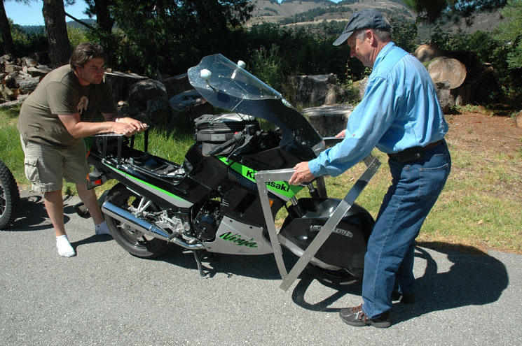 The next day, both Alan and I had come to the same conclusion: The Ninja seat was too high and had to go. This would allow us to mount the rear streamlining directly to the frame. Three points in space are required to locate something. We would build a structure that would be attached by three bolts only. It would be designed to come off - entirely - in seconds. The front streamlining will be mounted the same way. I am a lazy mechanic and have no patience for a design that is more trouble than it is worth. | |||||||||||||||||||||||||||||||||||||||||||||