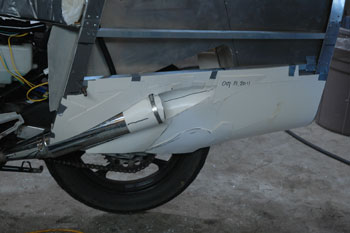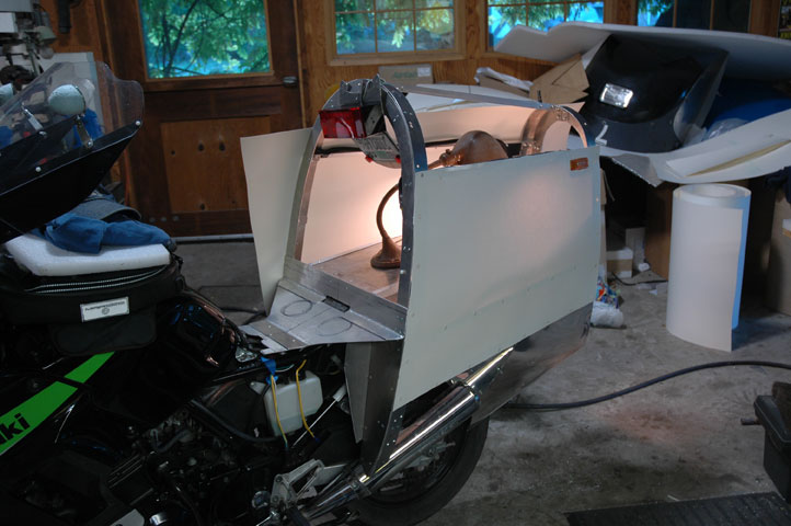 A small bulkhead finishes the new strucure This holds the new skin and keeps the rear from filling up wth stuff thrown up from the rear wheel. It is like a big fender. Think about this: There will no dirty water spray to be sucked up onto your back. | The next step is to make a symmetrical shape in milk carton paper. We need to test for tire clearance and to be sure the body still goes on and off. The Ninja's mufflers exit inside the surface of the streamlining. We must figure how to get the exhaust outside. | ||||||||||||||||||||||||||||||||||||||||||||||||||||