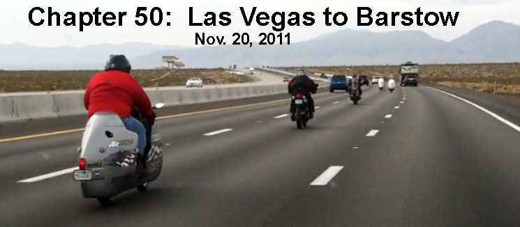 Oh yes... what about the suitability of Las Vegas to Barstow for a Vetter Challenge? On November 20, 2011, it was easy. No rain. No snow. No awful side winds coming from this way and then that. Not much traffic. It was easy, beautiful and fun. Locals say that what we experienced Sunday was pretty much the norm for this time of year. I am thinking it can work. The AMA has announced that it will have its Hall of Fame inductions in Las Vegas again in 2012. I am thinking that if the weather looks safe, we can and should hold the Final Vetter Challenge for the year between Las Vegas and Barstow. Your thoughts? | ||||||||||||||||||||||||||||||||||||||||||||||||||||||||
