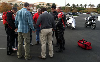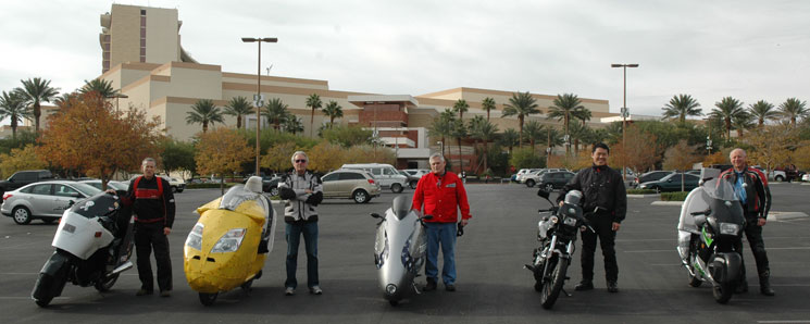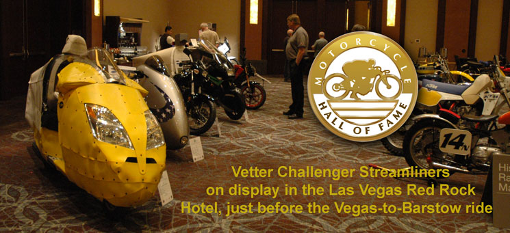 Earlier this year, I wondered if Interstate 15 between Las Vegas and Barstow would make a good Final Vetter Challenge course. It is long... 173 miles. It is fast... 70 mph all the way. It is up and down hills... beginning at 1,200 feet above sea level and going over two 4,000 feet passes on the way to Barstow. It can have awful winds. Best of all... it is real. Five of the new Challengers met at the AMA Hall of Fame Inductions in Las Vegas to check out the possibilities. First, we displayed our machines Saturday at the David Mungenast Memorial Concours. | ||||||||||||||||||||||||||||||||||||||||||||||||||||||||