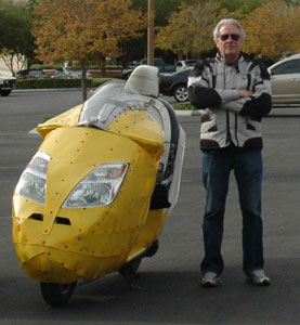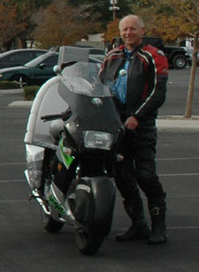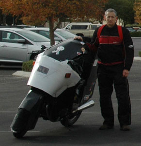 During the fuel economy competition, I was surprised that speeds on my speedometer were closer to 75 MPH or higher. A couple of times I topped 80 MPH to keep in the group. I was worried that the higher speeds would drop my fuel consumption. Crossing over the two mountain passes; I was able to pull it in top gear. If I needed extra power I could always down shift a couple of gears. At 70 MPH the engine is only turning about 6,500 RPM, red line is 13,000 RPM. So I have a lot of reserve power to play with. As far as my streamliner protecting me from the elements, the current configuration has my hands and feet exposed to the wind. During nice weather this is not a problem since the rest of me is well protected. The ride home from Las Vegas was in heavy rain and strong wind for over an hour before crossing the mountain pass. At the mountain pass the air temperature was 37 degrees (F), my gloves and boots were soaked so my hands and feet froze. The rest of me was comfortable. That is one reason that I need to up-grade the front of my streamliner this winter. Also none of my gear got wet in the new tail during the heavy rain. For next year’s competition I want to try even taller gearing and improve the aerodynamics of the front (get the hands and feet out of the wind). If I can afford it I would like to have someone look at my engine to see if any improvements can be made. My goal is to average over 100 MPG next summer in day-to-day riding, which means cruising 70 MPH on the freeway not 55. I think I will have a busy winter." | ||||||||||||||||||||||||||||||||||||||||||||||||||||||||