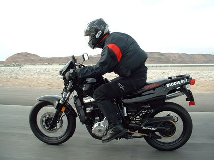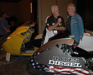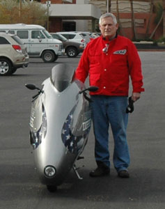 I also noticed that when I tucked completly in, with the same throttle, the speed picked up instantly 3~4 MPH. But I could only hold that position for a few second because I couldn't see the road well in that position. Fred Hayes, the bike's owner and builder adds: "The Street Fighter had a new modification to the air box and intake manifold, and had taller gearing over what we had at Quail. The engine is tuned for max hp, not fuel mileage. The same as was Dale's during Mid Ohio. The fuel mileage actually seems better with performance engines. Obviously, Joshua was totally exposed." | ||||||||||||||||||||||||||||||||||||||||||||||||||||||||